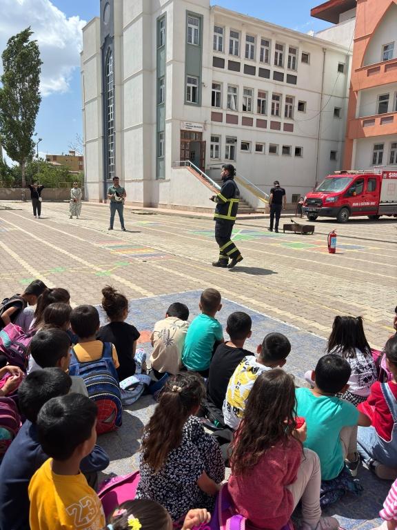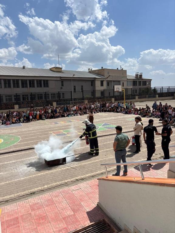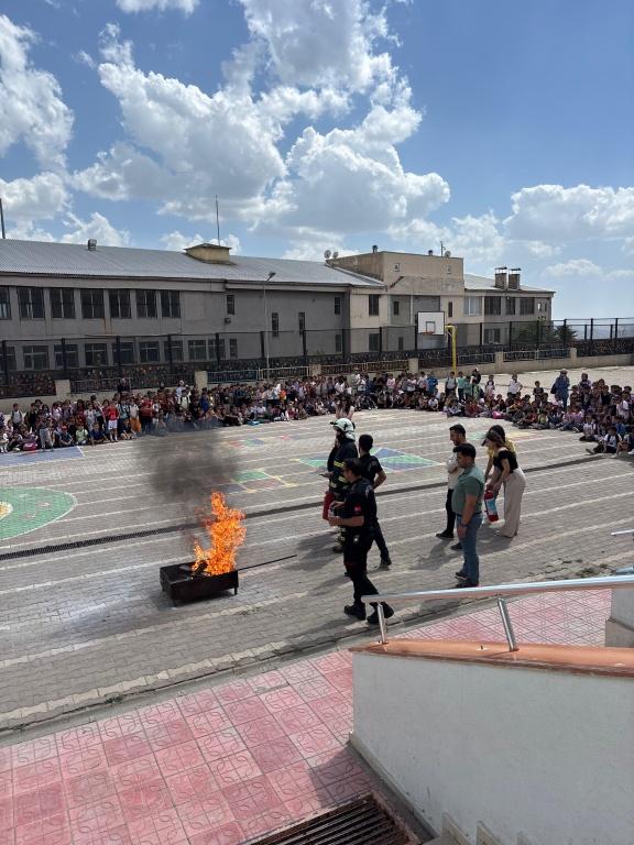 İtfaiye ekipleri tarafından yangın anında nasıl davranılması gerektiği, güvenli tahliye yolları ve yangından korunma yöntemleri hakkında öğrencilere detaylı bilgiler verildi.